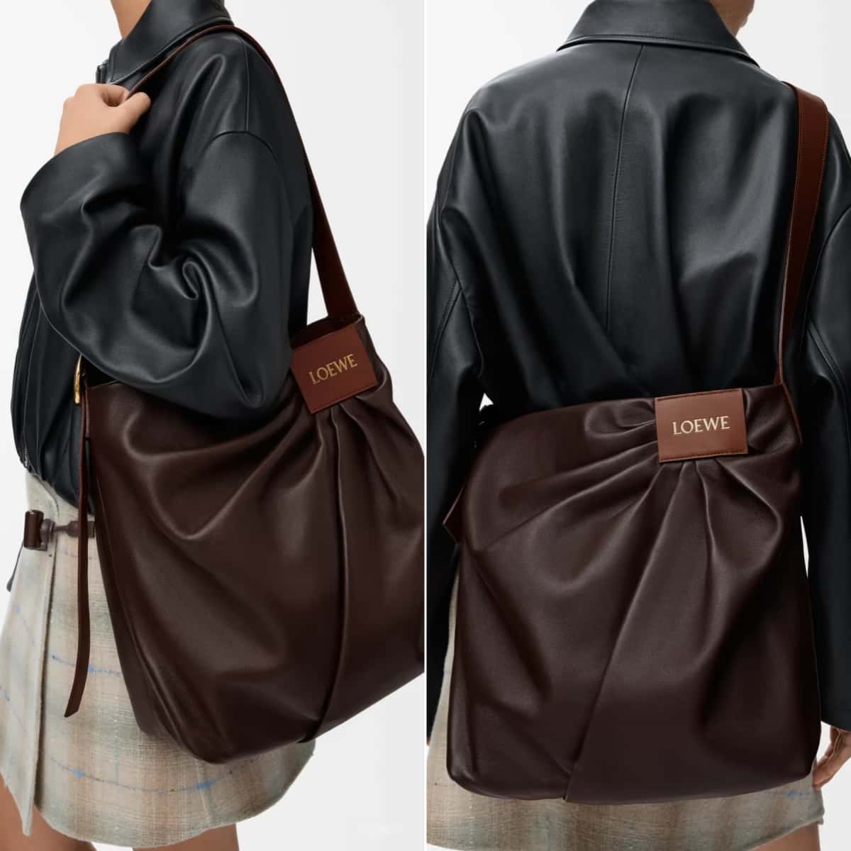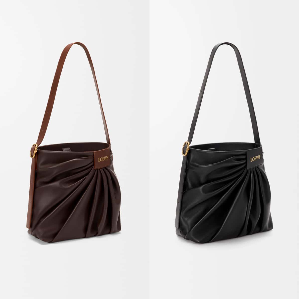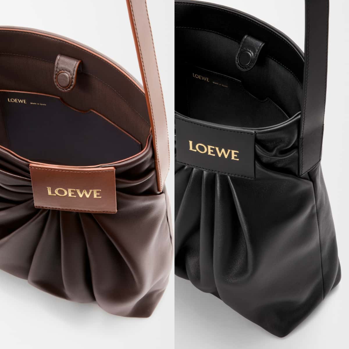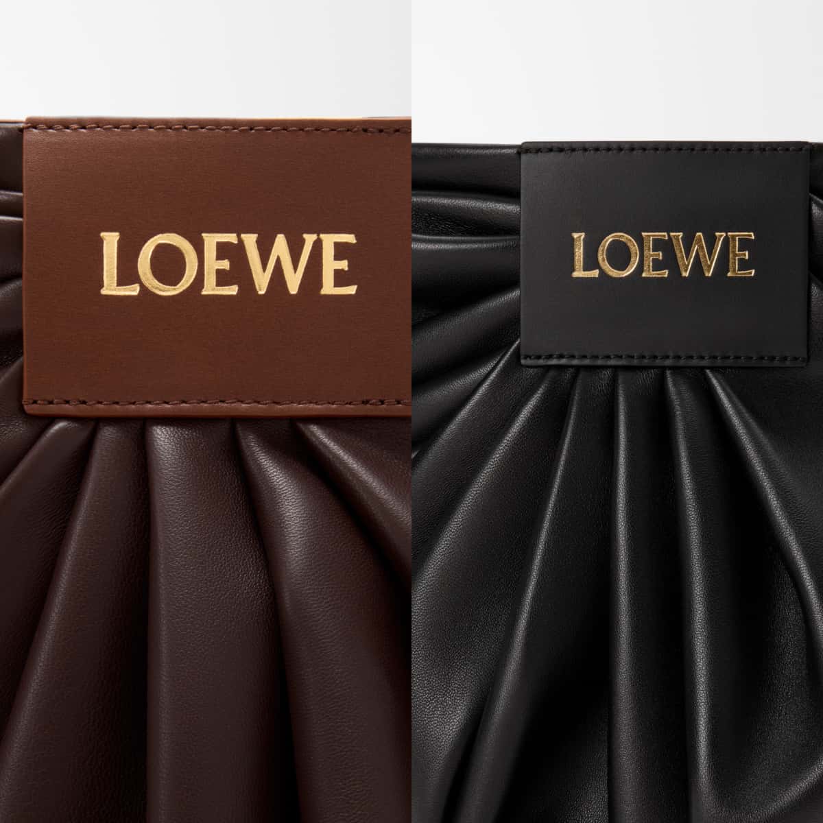 ドレープトートは、ロエベのシグネチャーであるプレタポルテのドレープシルエットからインスピレーションを得た、個性的なバッグです。柔らかな曲線を描くフォルムに、大胆なロエベの刻印入りバックルがあしらわれた幅広ストラップがアクセントになっています。このバージョンは、しっとりとしたナッパラムスキンを使用しています。