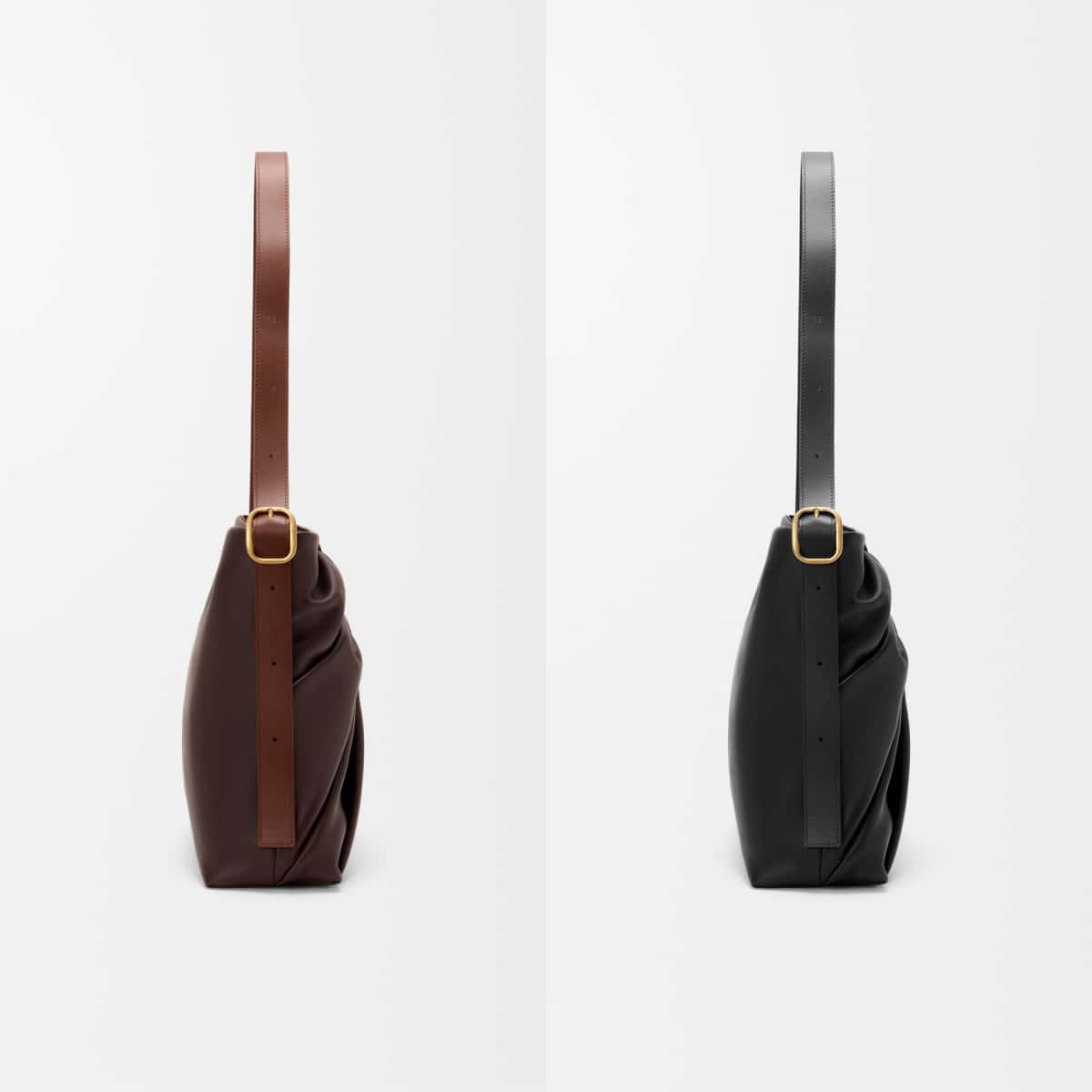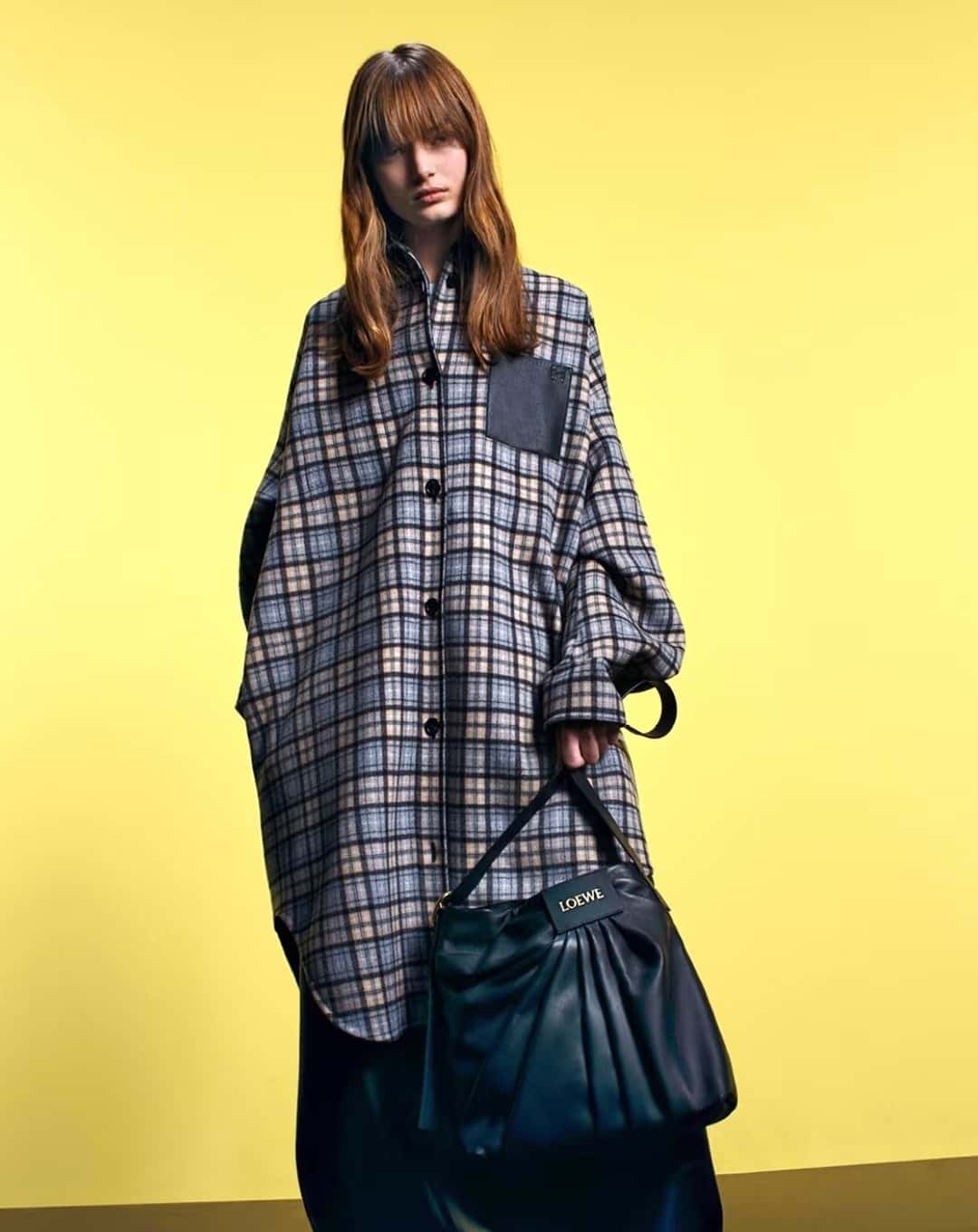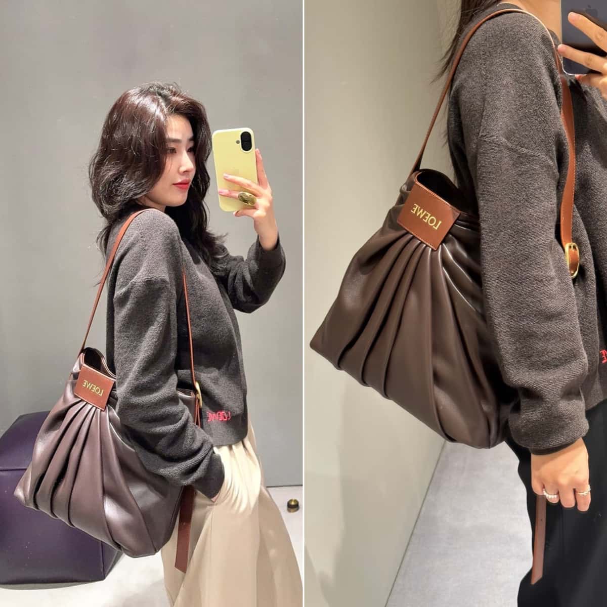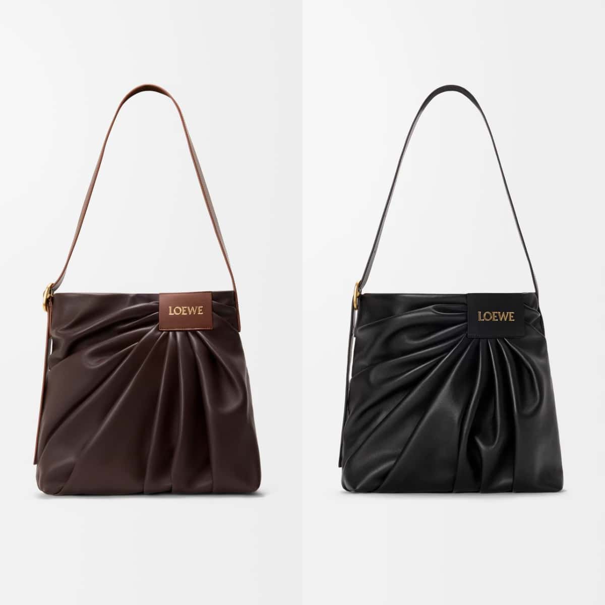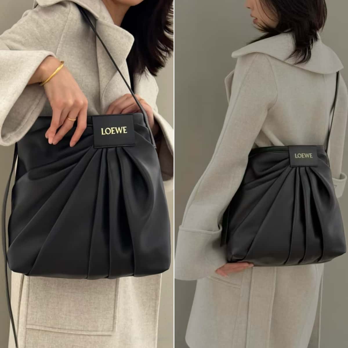 ドレープトートは、ロエベのシグネチャーであるプレタポルテのドレープシルエットからインスピレーションを得た、個性的なバッグです。柔らかな曲線を描くフォルムに、大胆なロエベの刻印入りバックルがあしらわれた幅広ストラップがアクセントになっています。このバージョンは、しっとりとしたナッパラムスキンを使用しています。